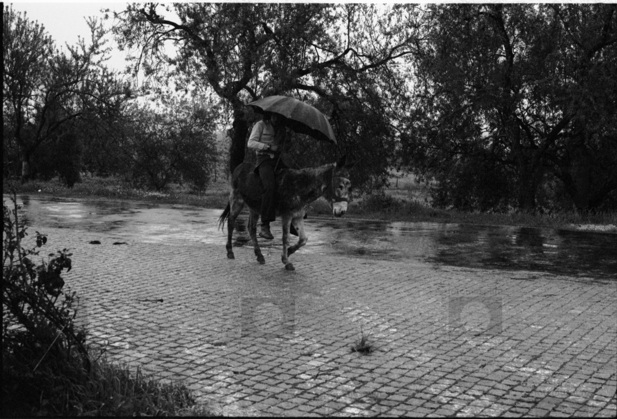 man op ezel met paraplu in de regen, Portugal