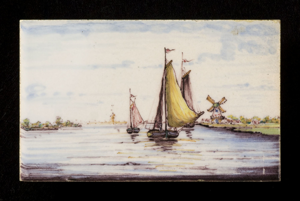 Tegel in onderglazuur, voorstellende rivier met sche...