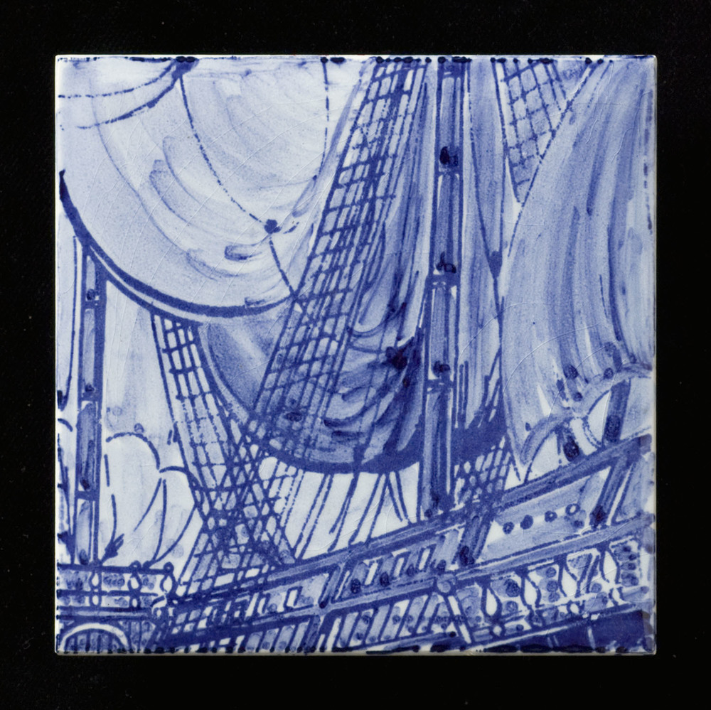 Tegel in tinglazuur, voorstellende scheepvaarttafere...