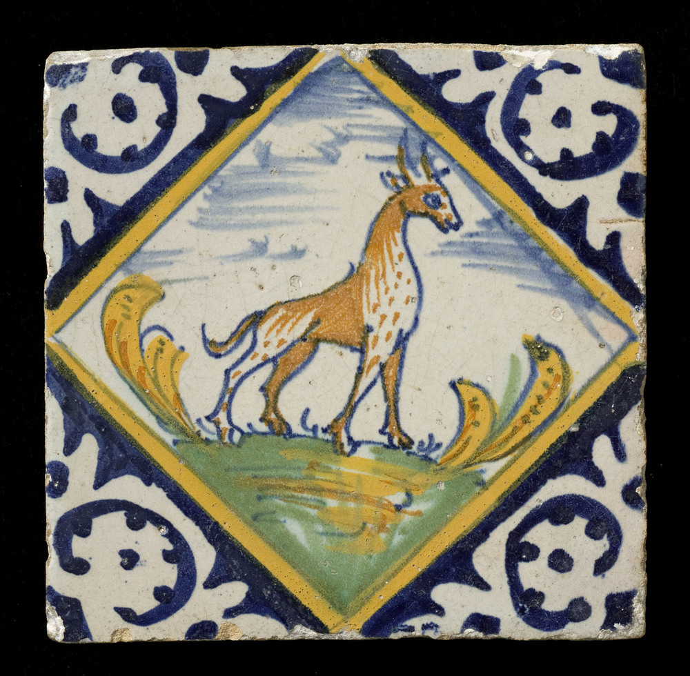 Tegel van keramiek met tinglazuur, voorstellende: or...