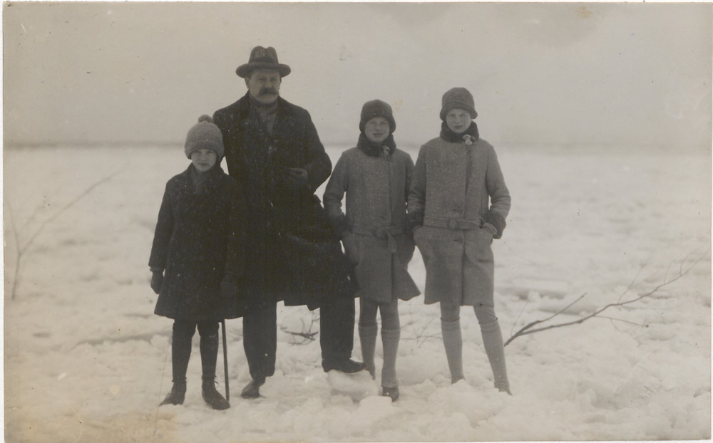 Dichtgevroren rivier de Waal, man met hoed en drie m...