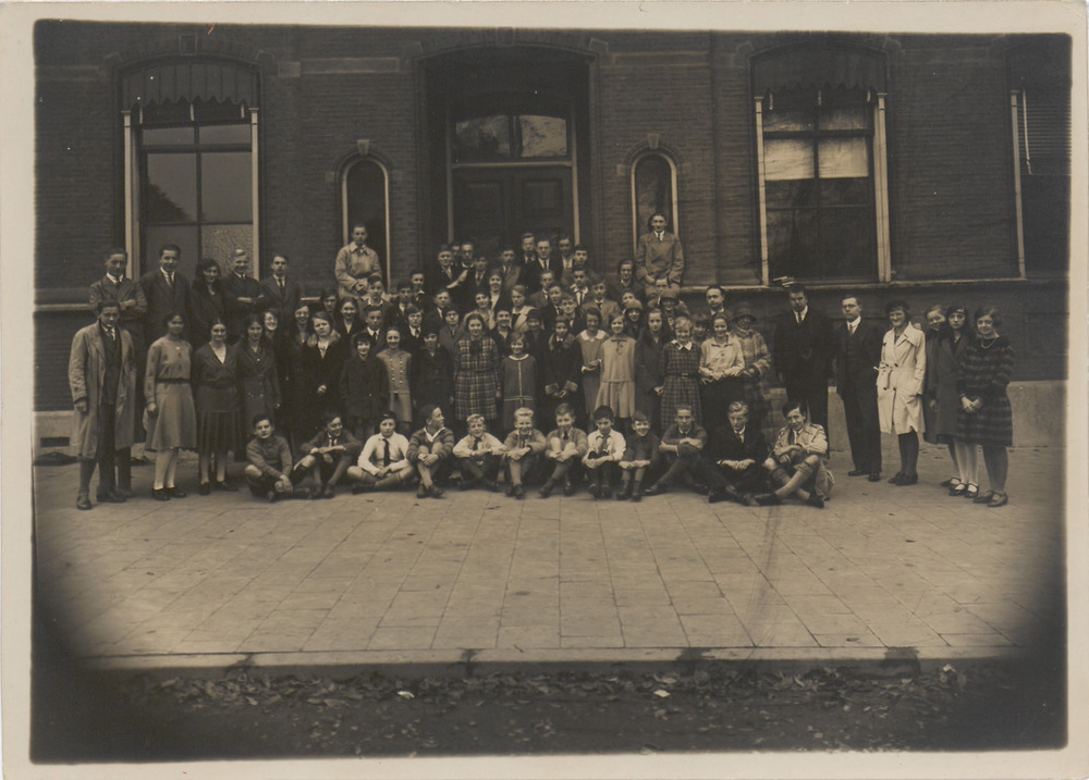 Leerlingen en docenten voor het gymnasiumgebouw aan ...