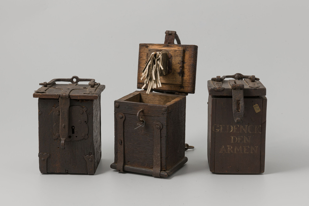 Collectebus, van hout, met metalen beslag