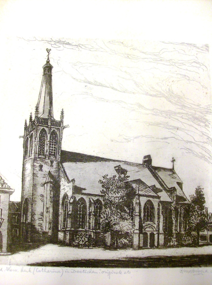 Linoleumsnede, waarop de Nieuwstad in Doetinchem.
