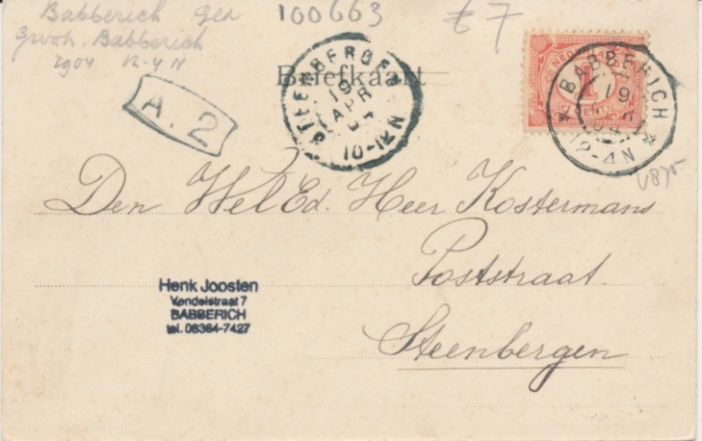 Ansichtkaart J.H. Nienhuijs voor zijn winkel te Babb...