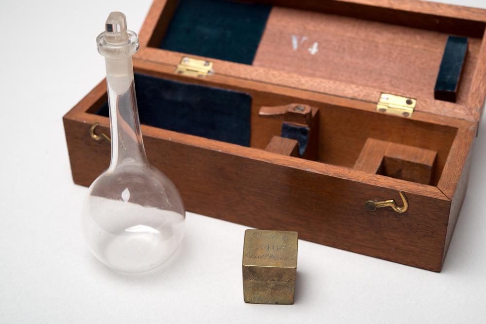 Pyknometer in kist met kistje met gewichten