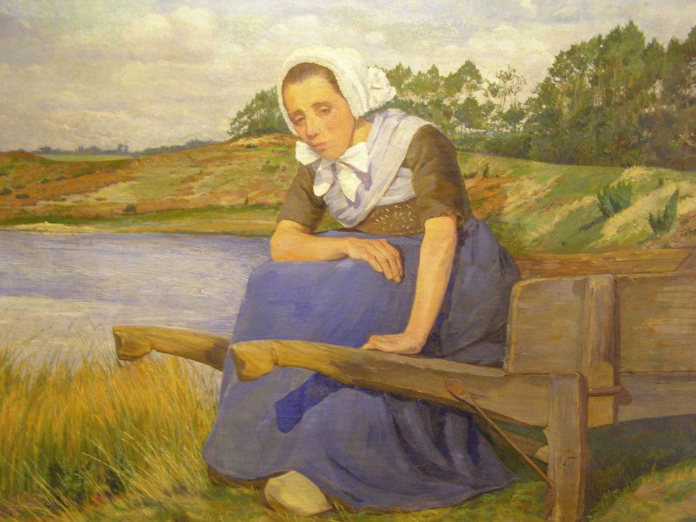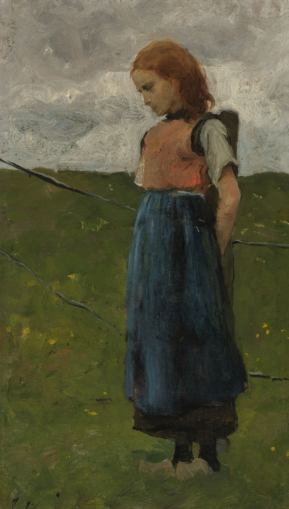 boerenmeisje staand tegen een paal