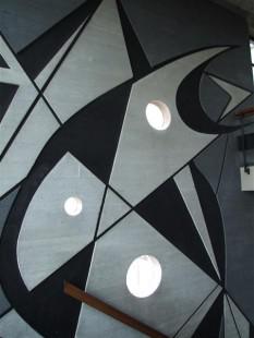 Toegepaste materialen zijn witte, grijze en zwarte natuurstenen. Vlakke witmarmeren, hardstenen en zwarte diabas-tinten gezaagde platen, zijn afgewisseld met vlakken in breuksteenstrippen, waartussen getinte specievoegen de figurering versterkt. (1)