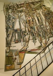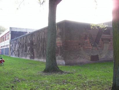 Speciaal geselecteerd werden afgekeurde, gesinterde en kromgetrokken bakstenen. Gesmolten glasverkleuringen zijn toegepast in ovenvlammen, zon en de graanmolen (1)