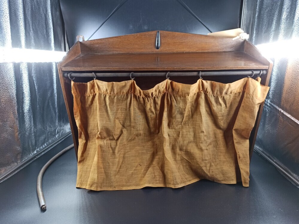 Houten kastje met oranje gordijn