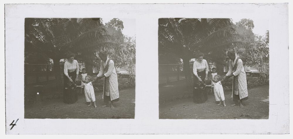 Vrouw met kinderen in tuin in Batavia (Jakarta) in v...