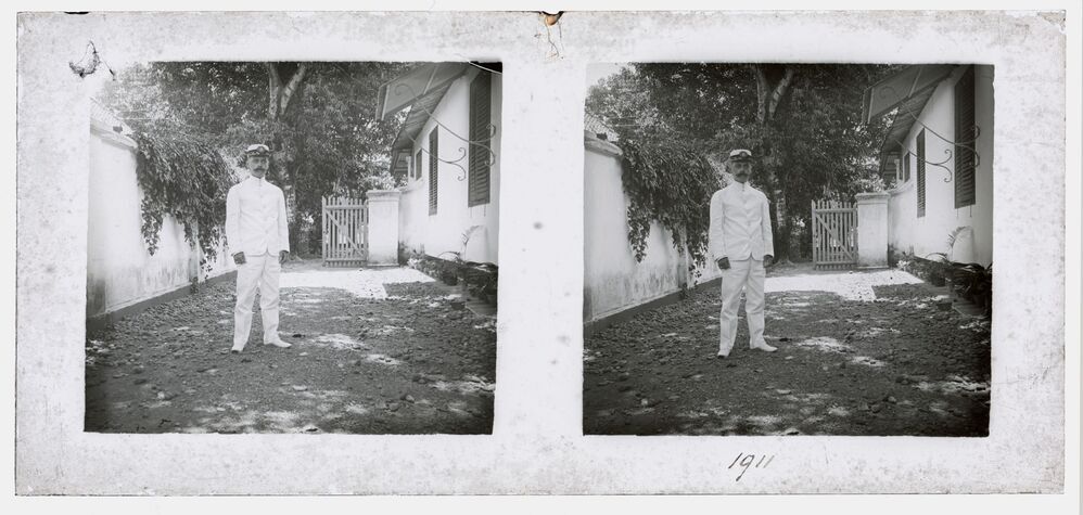 Man staande naast gebouw in Batavia (Jakarta) in voo...