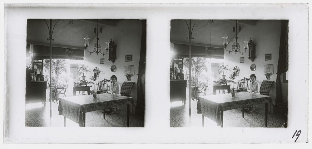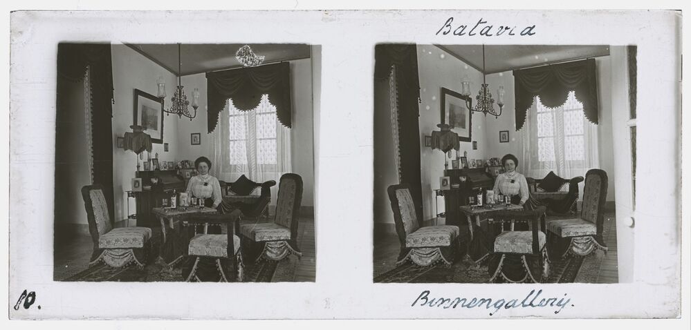 Vrouw zittend aan tafel in Batavia (Jakarta) in voor...