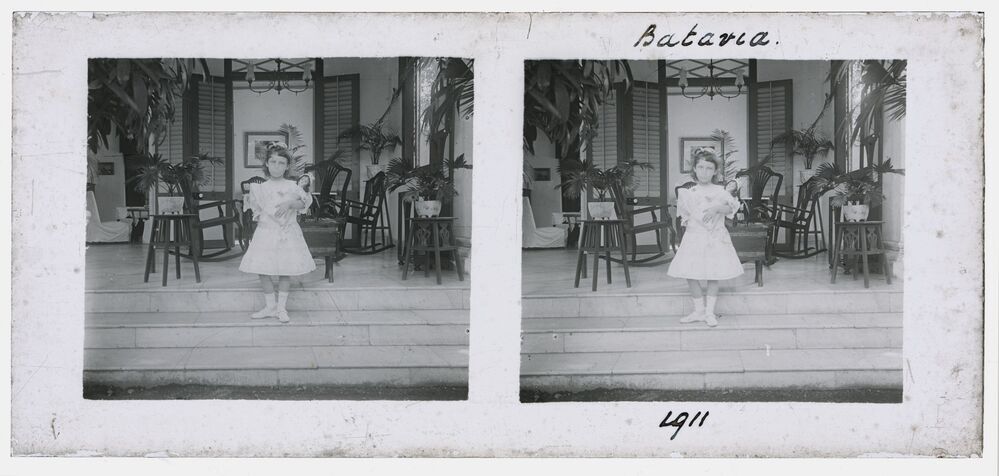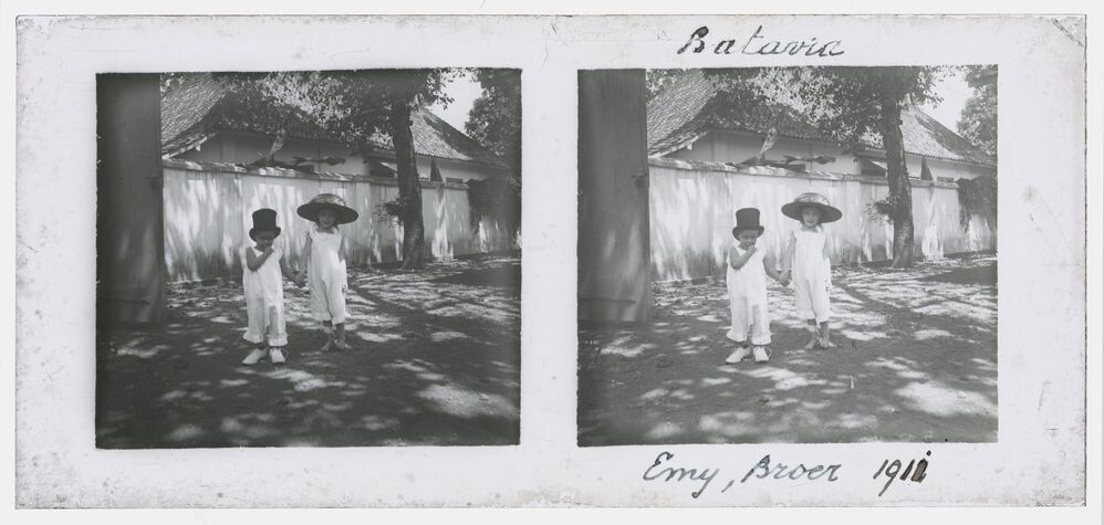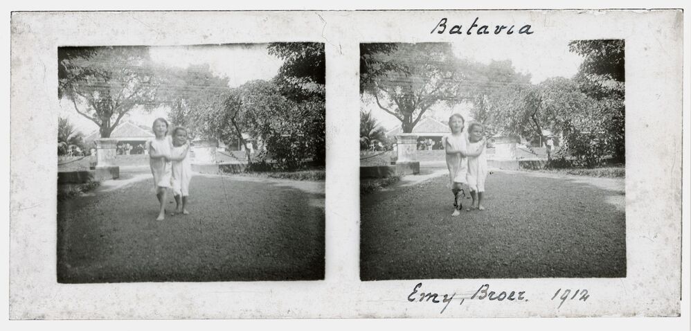 Twee kinderen in tuin in Batavia (Jakarta) in voorma...