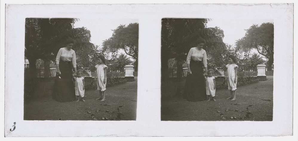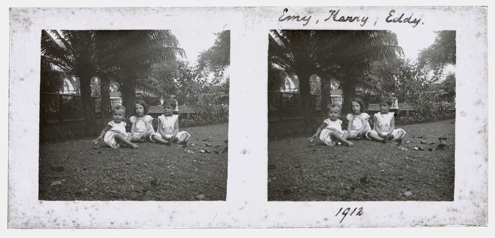 Drie kinderen in tuin in Batavia (Jakarta) in voorma...