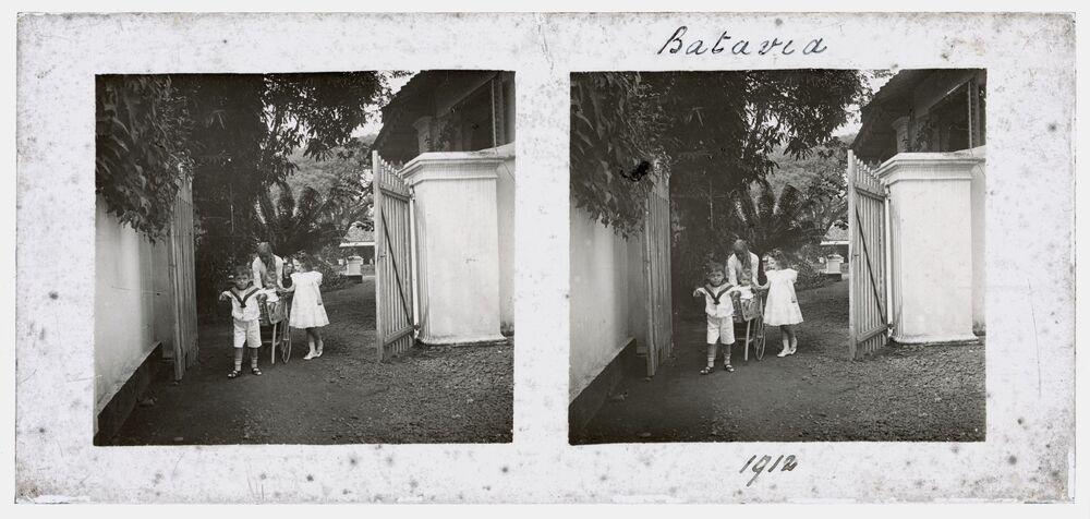 Volwassene en drie kinderen voor een hek in Batavia ...