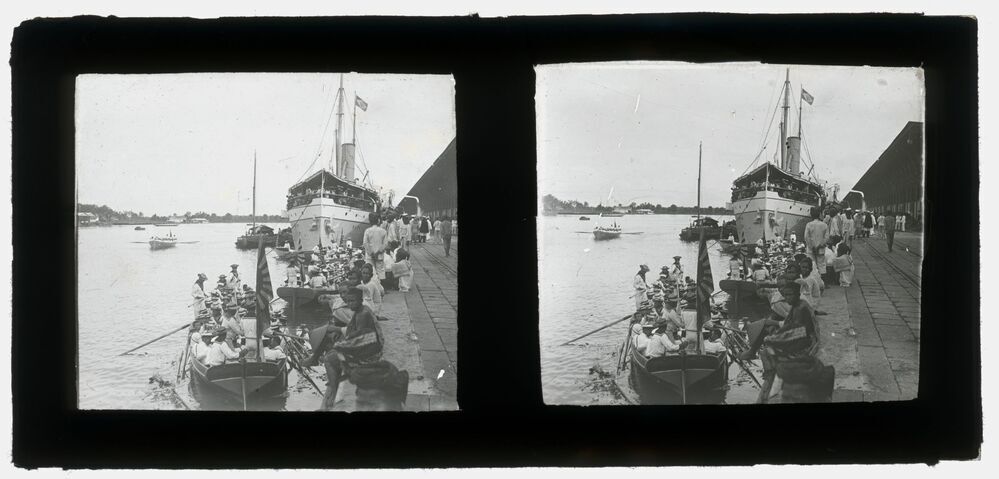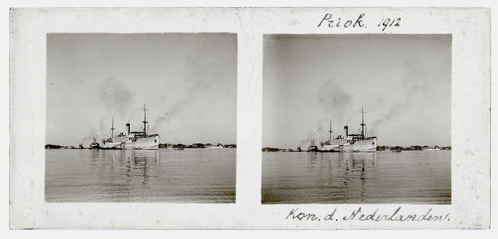 Schip Koningin der Nederlanden bij Priok in voormali...
