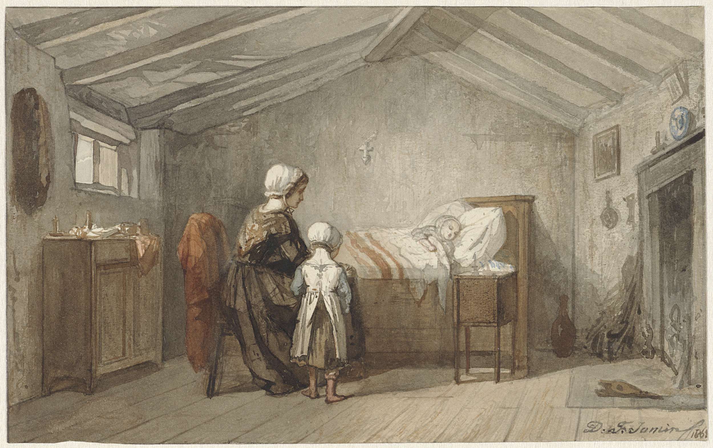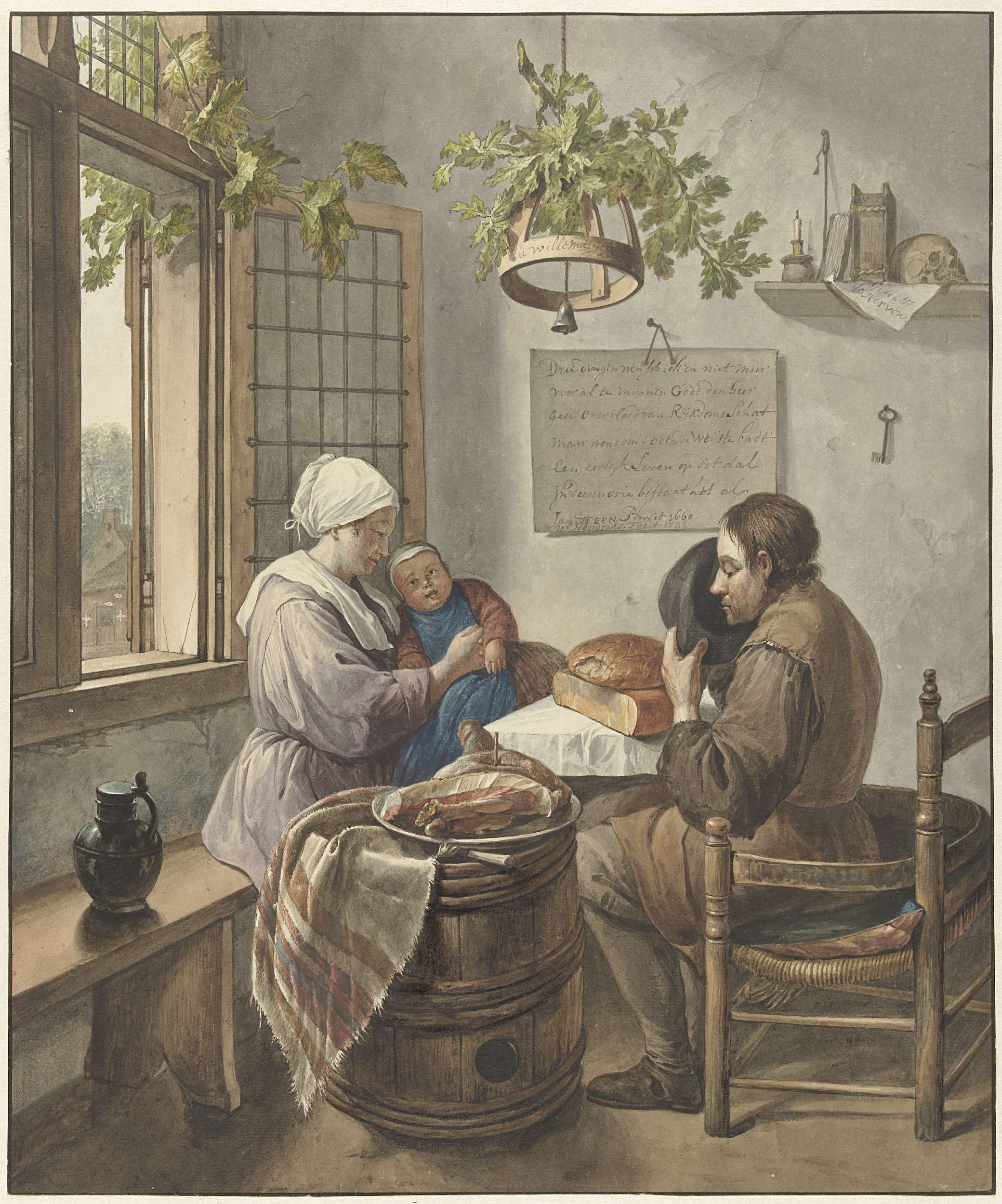 Kerkinterieur met man die bedelaarster een aalmoes g...