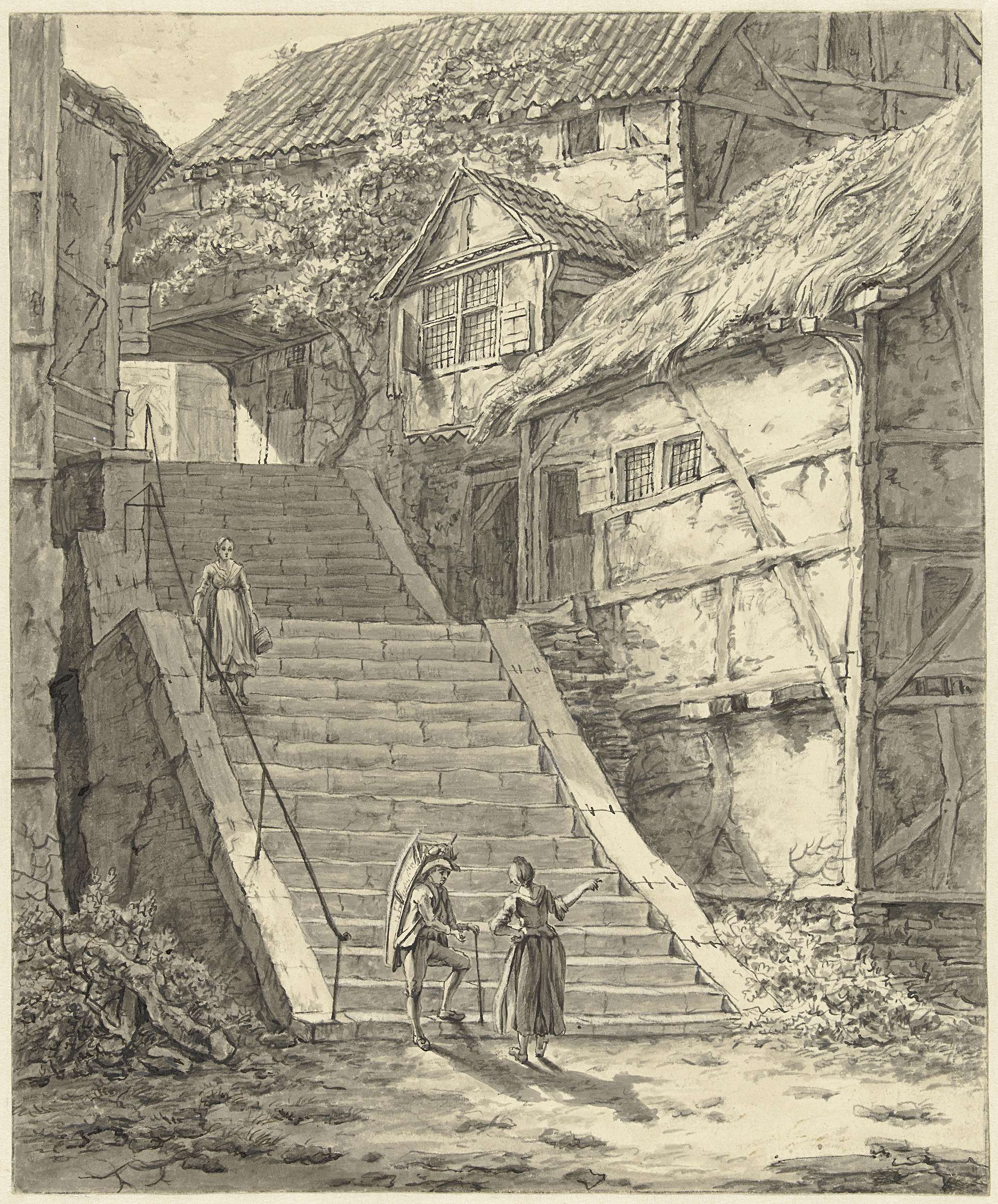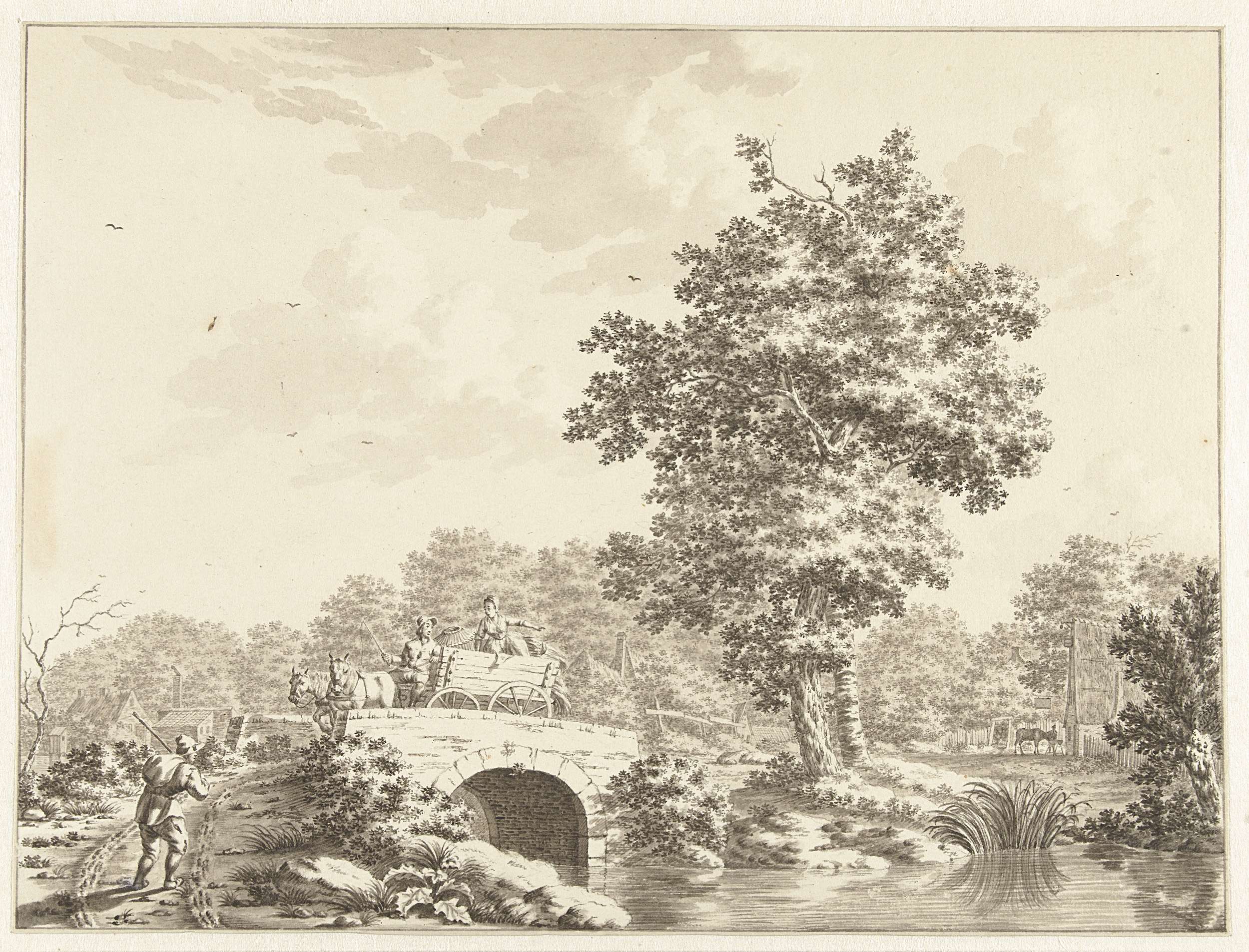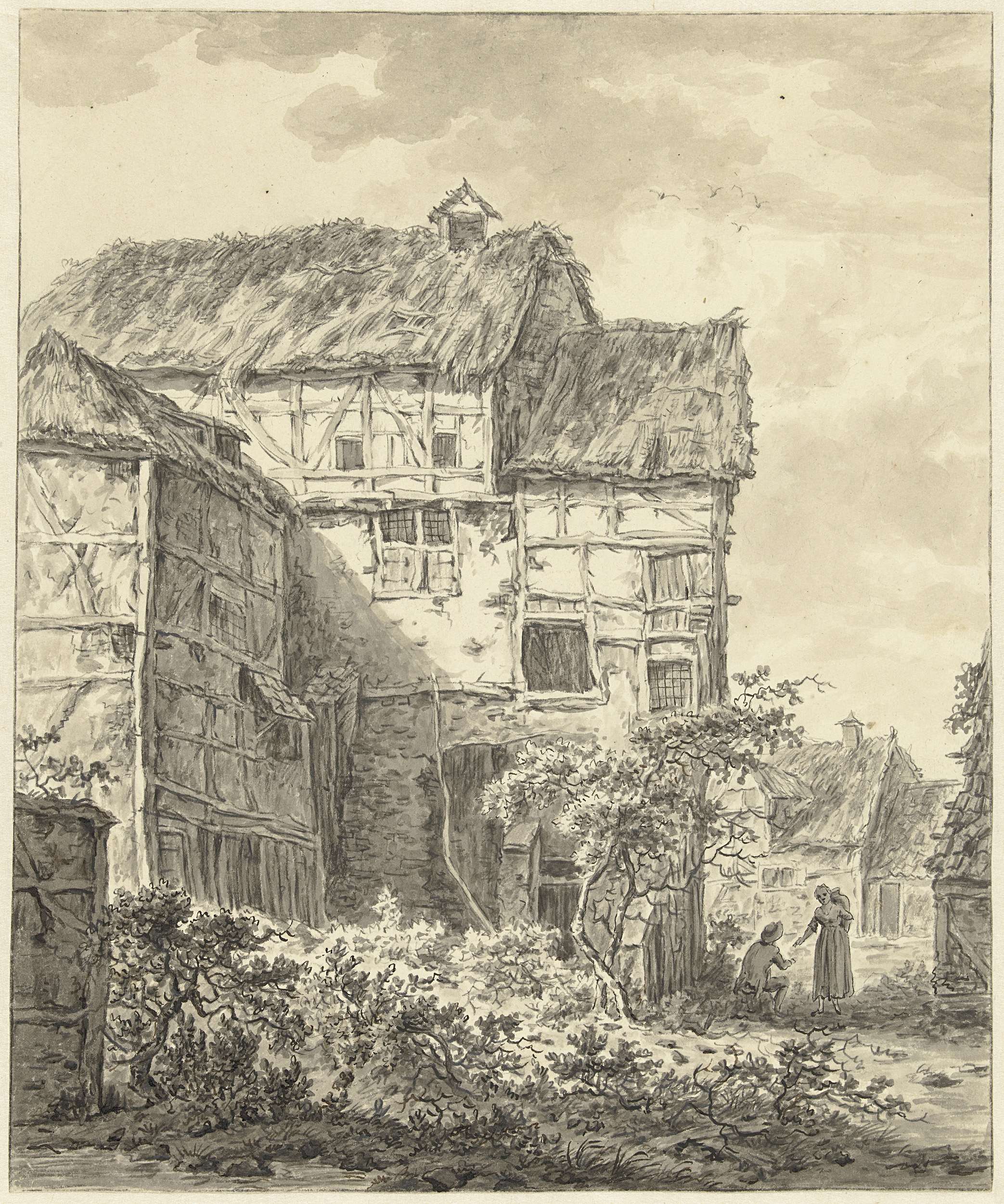 Landschap met huis voor ruïne en op de voorgrond twe...