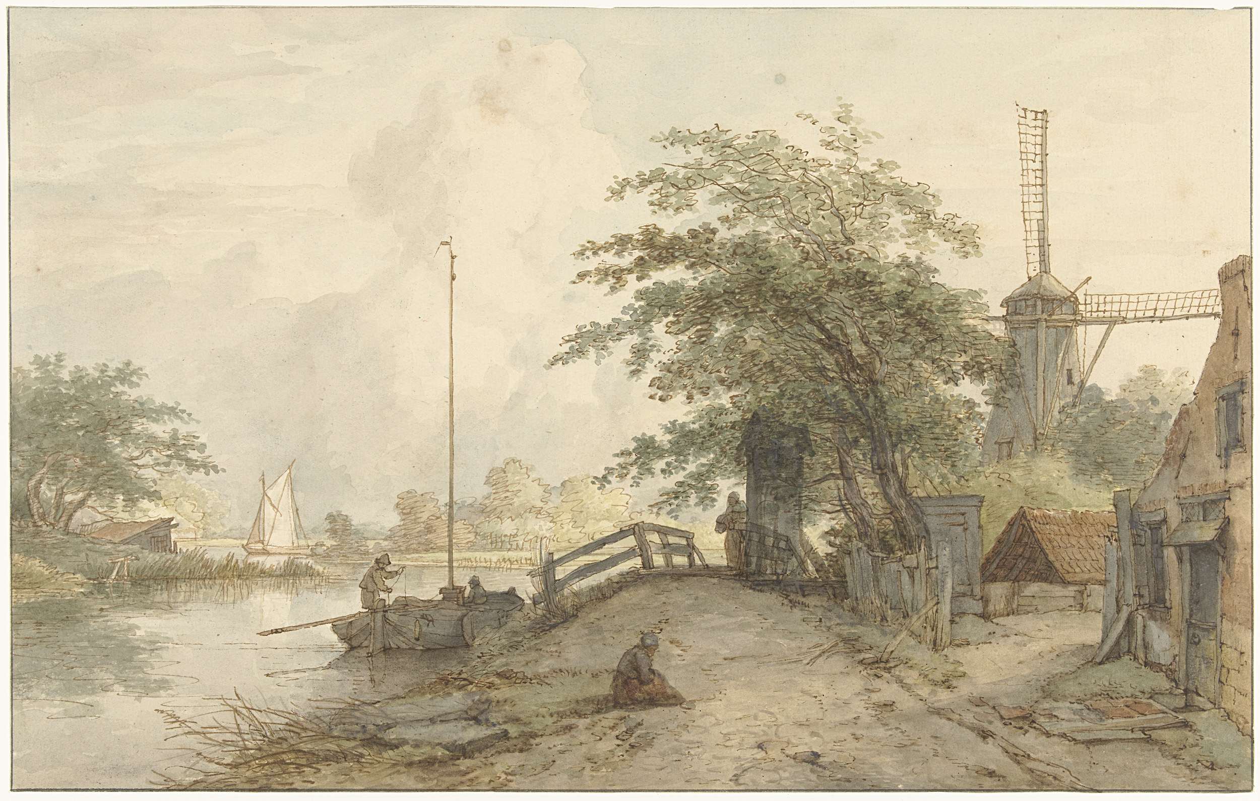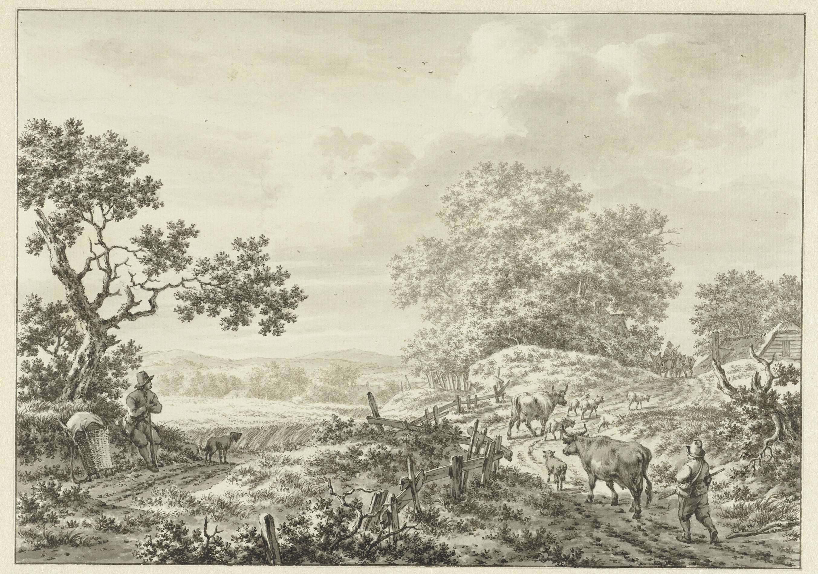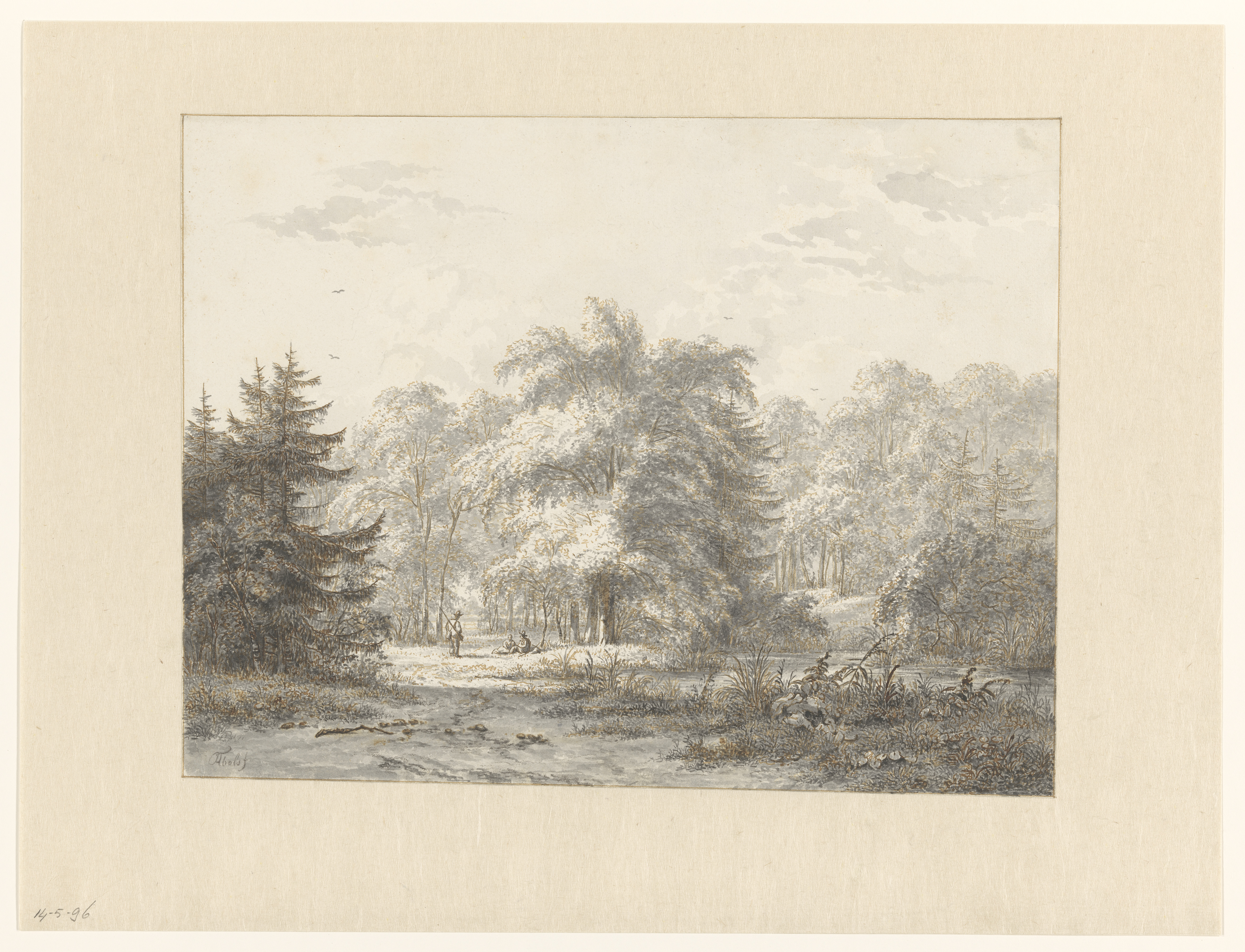 Landschap met huis voor ruïne en op de voorgrond twe...