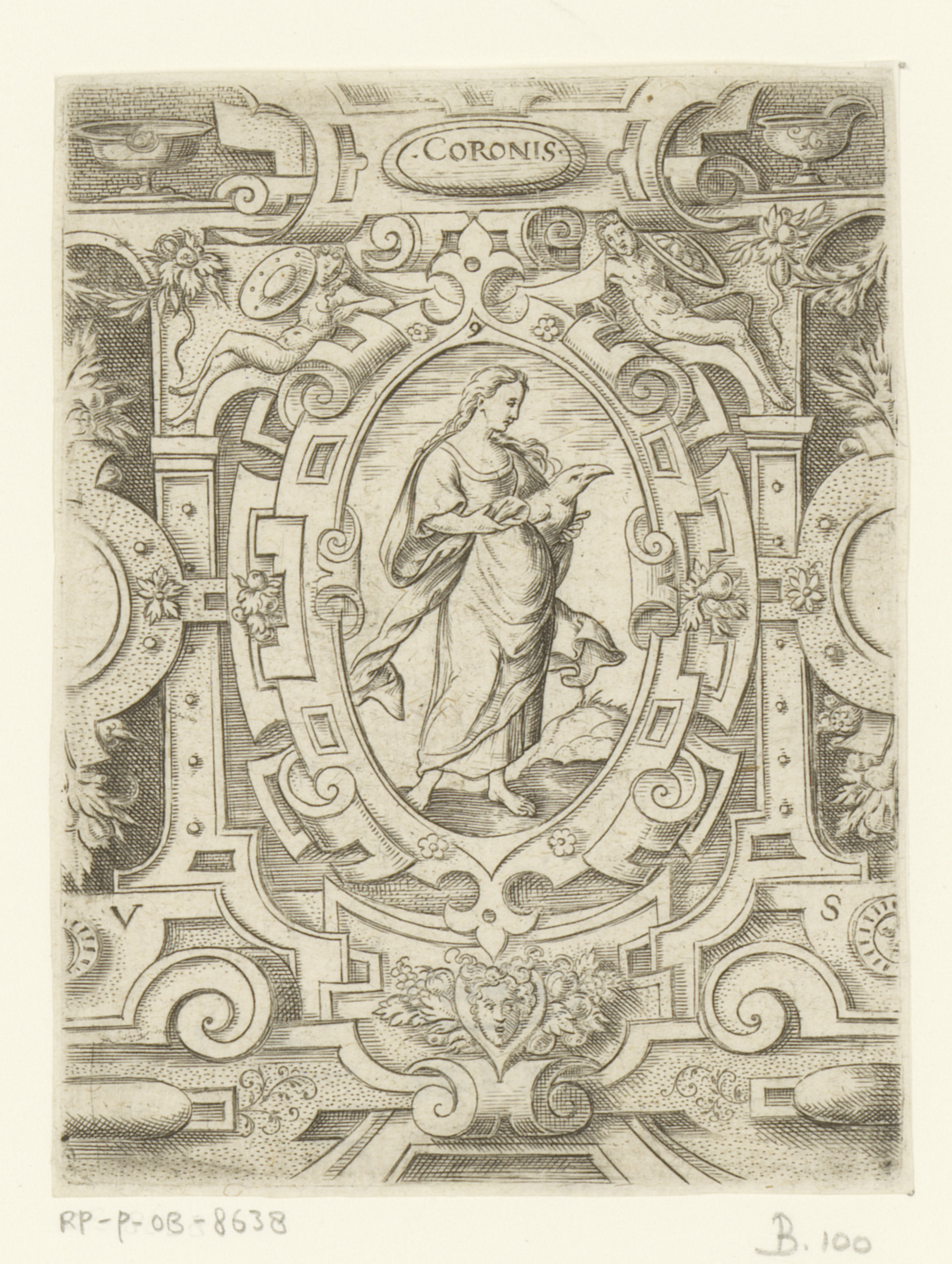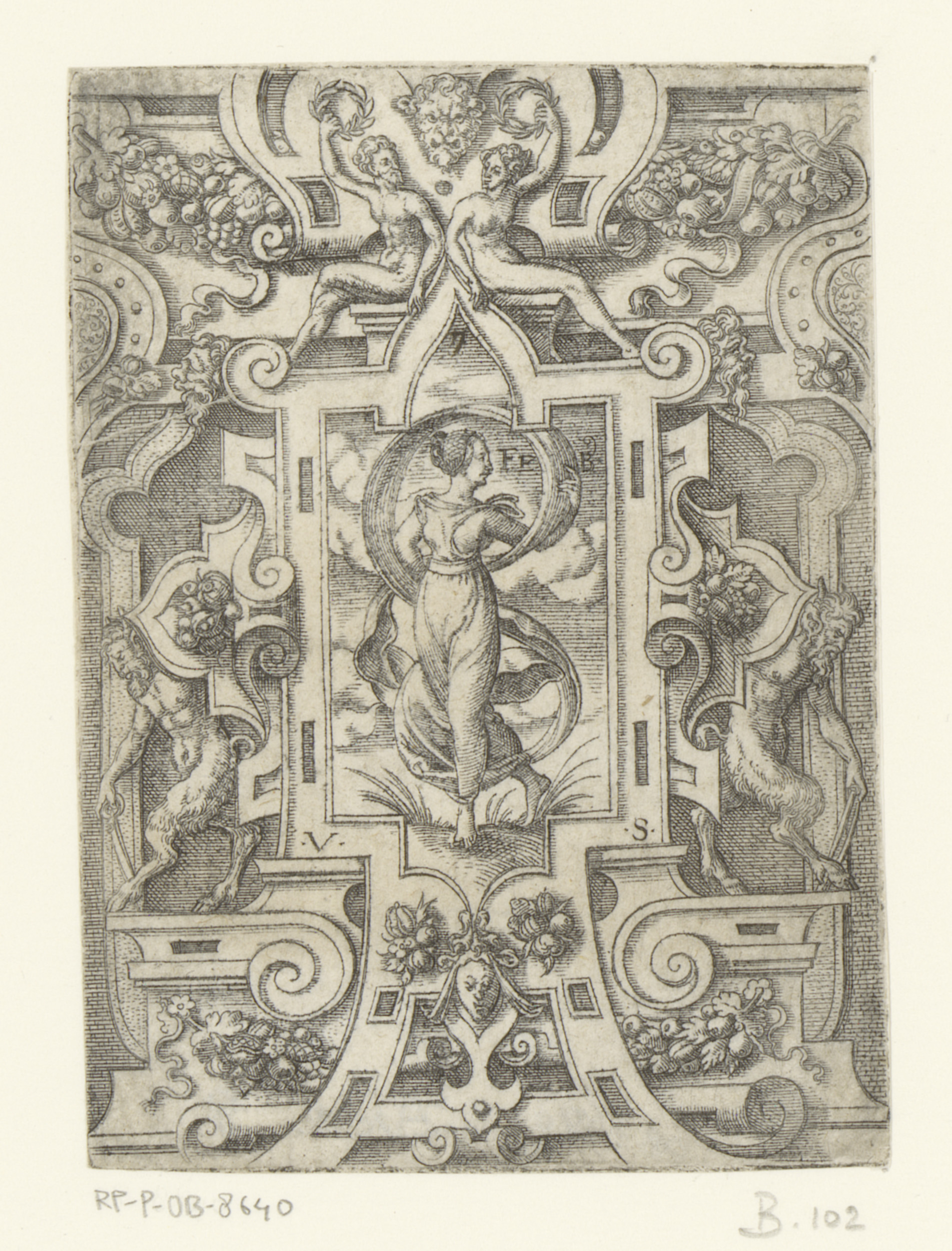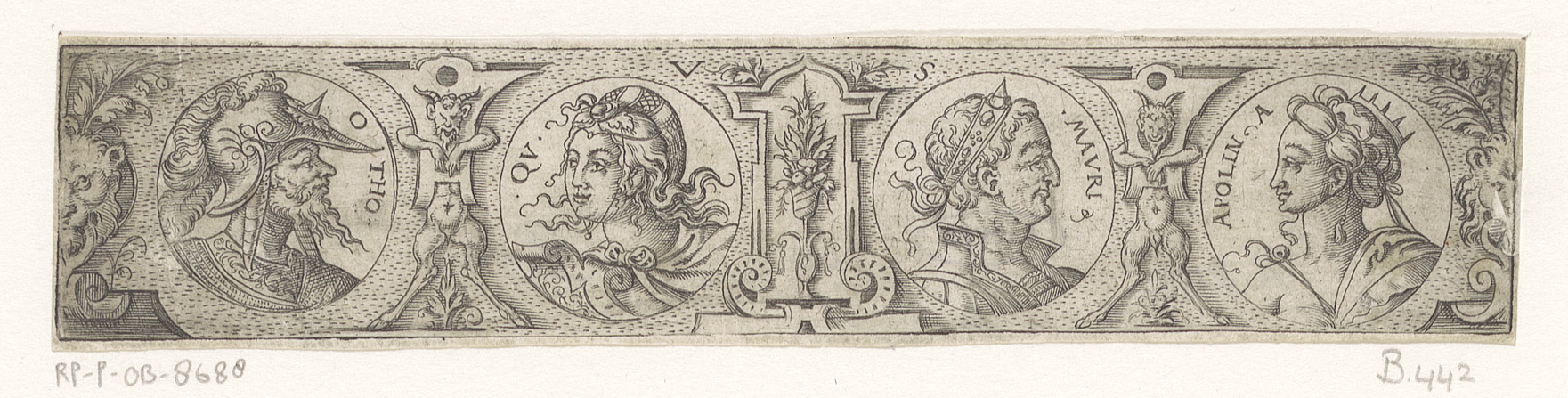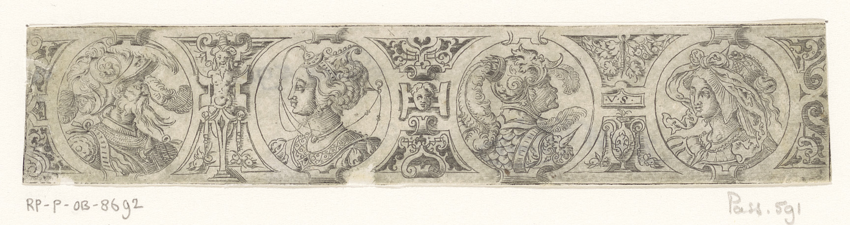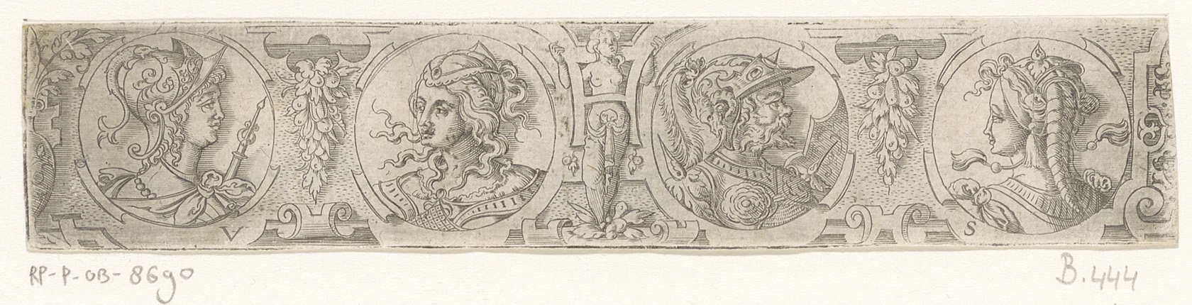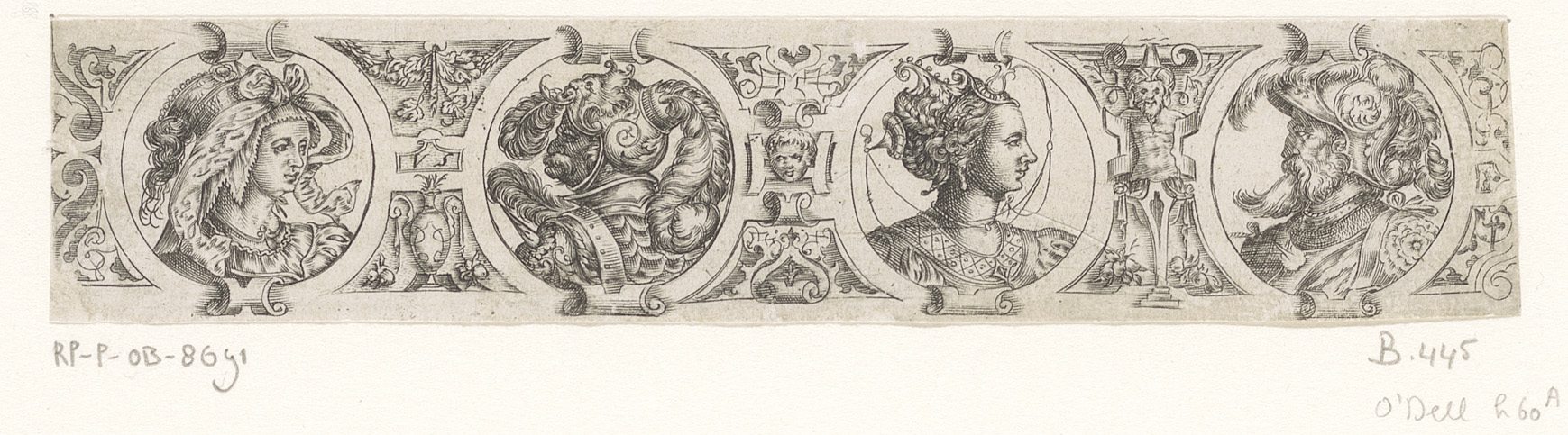 Fries met drie bustes van vrouwen omgeven door gebla...