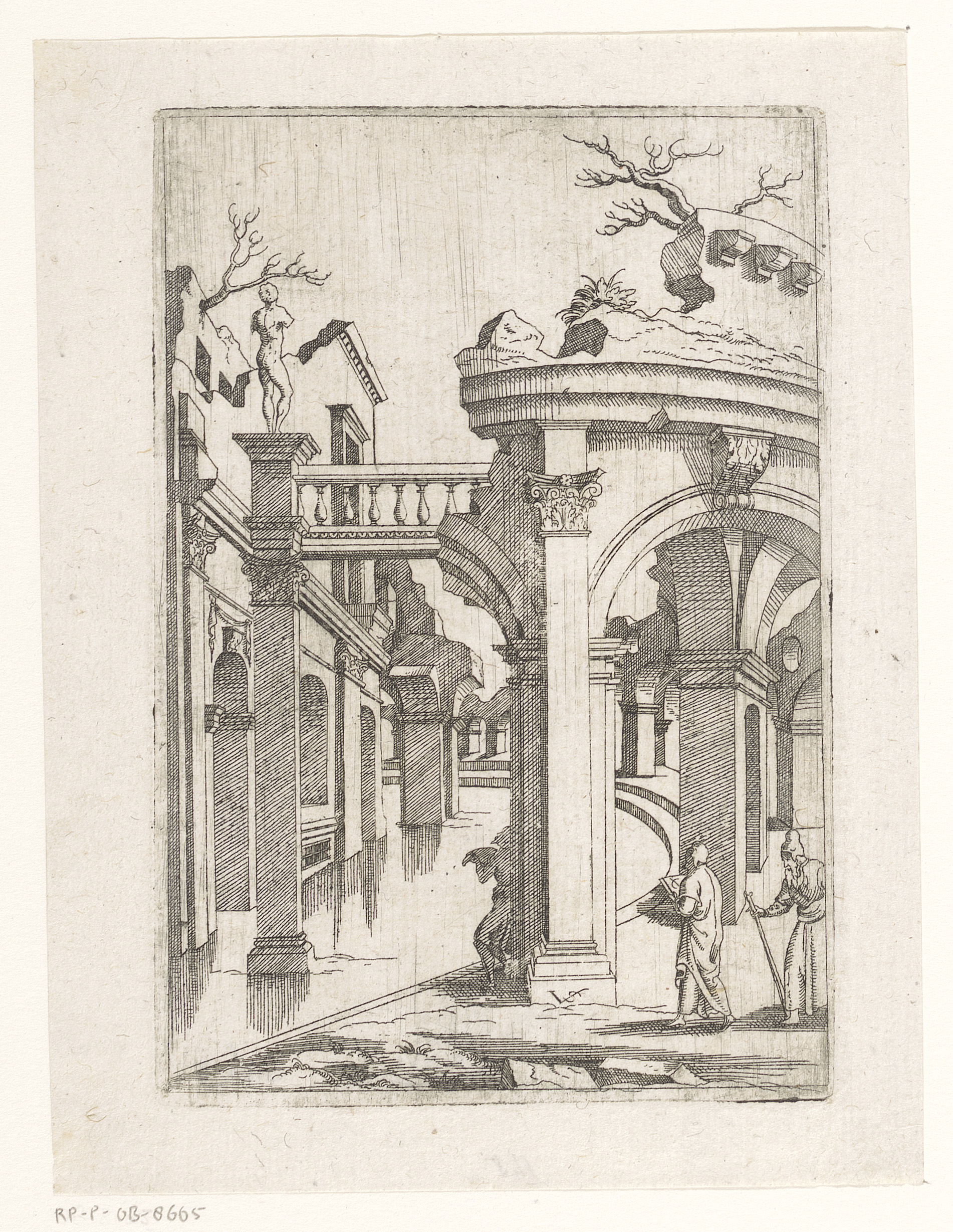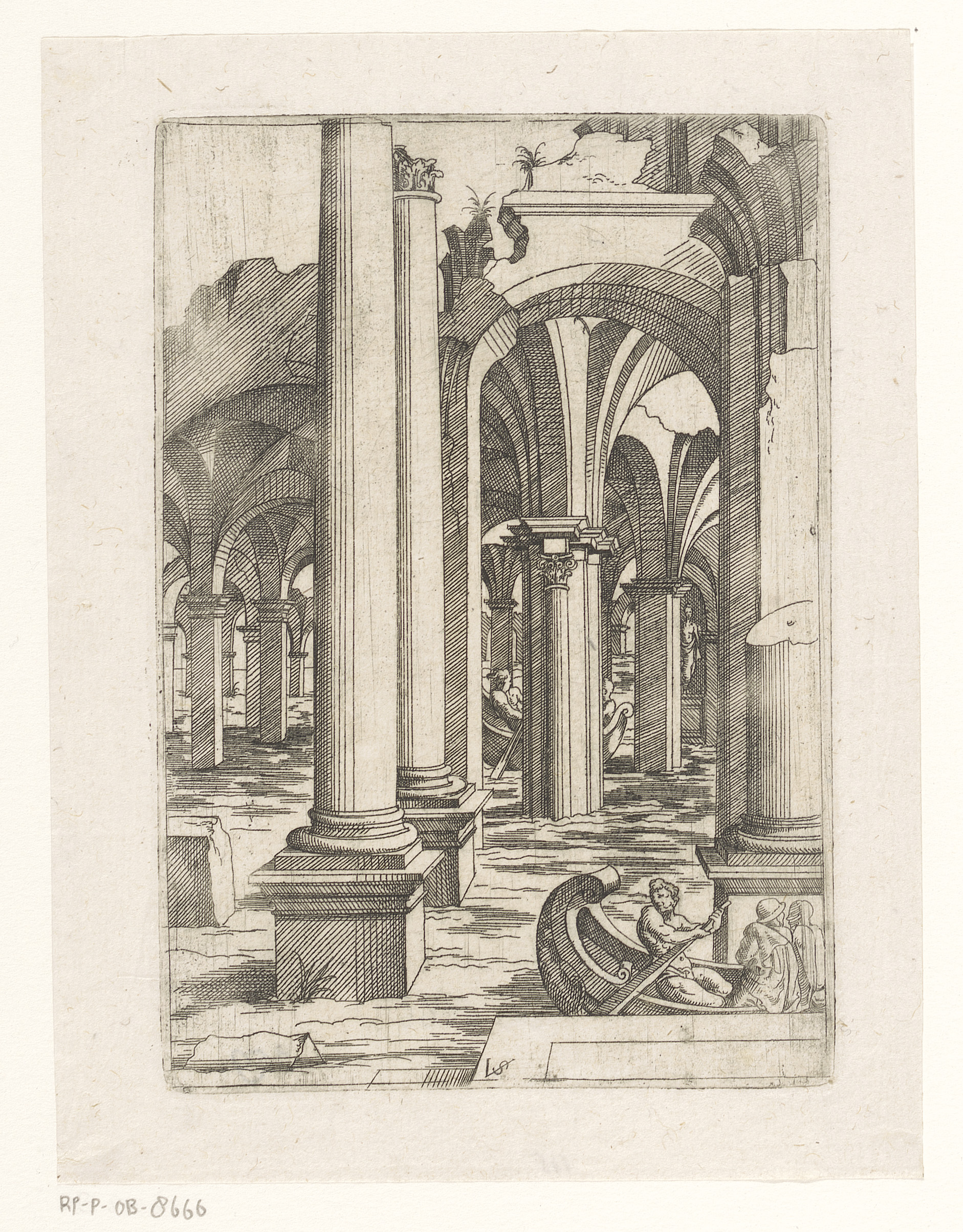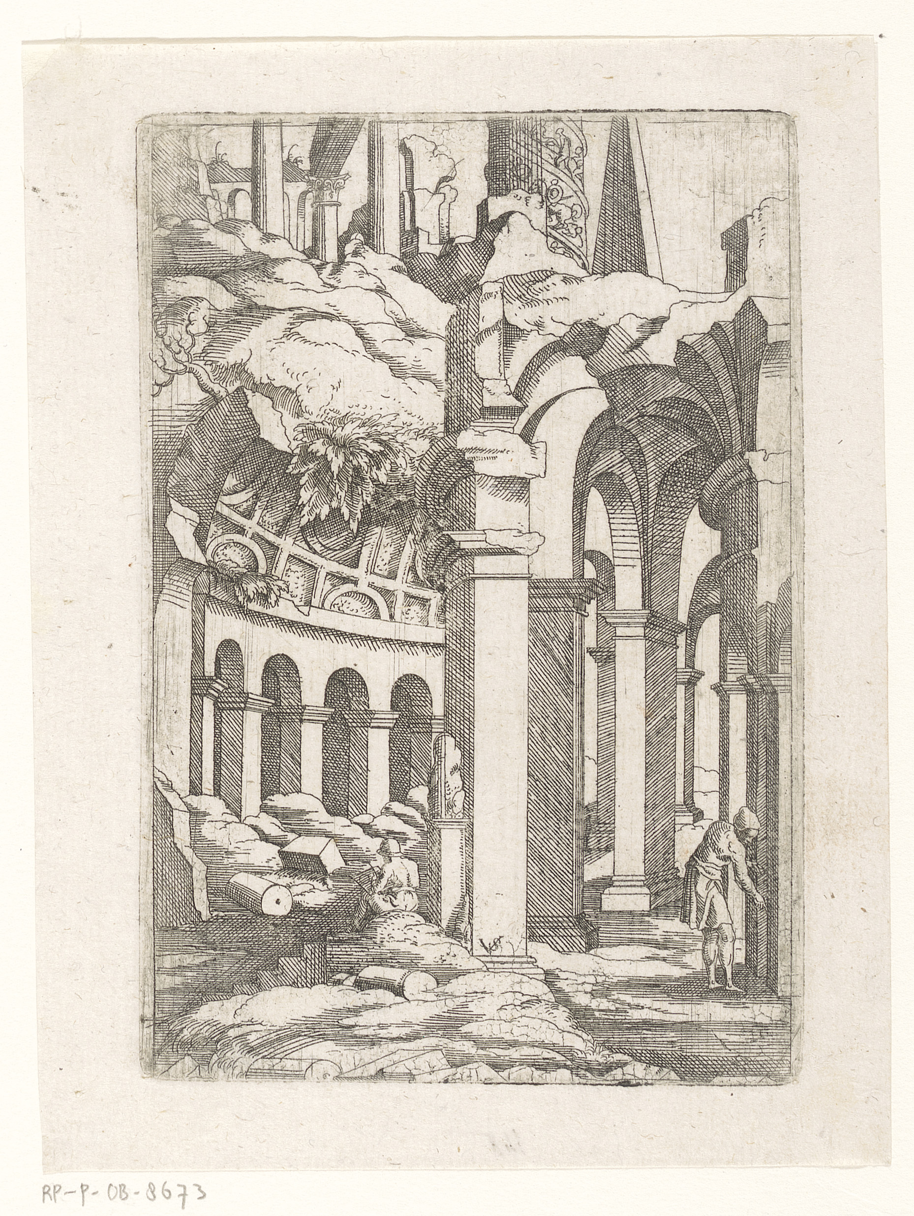 Ruïneuze bouwwerken waaronder drie Korinthische zuilen