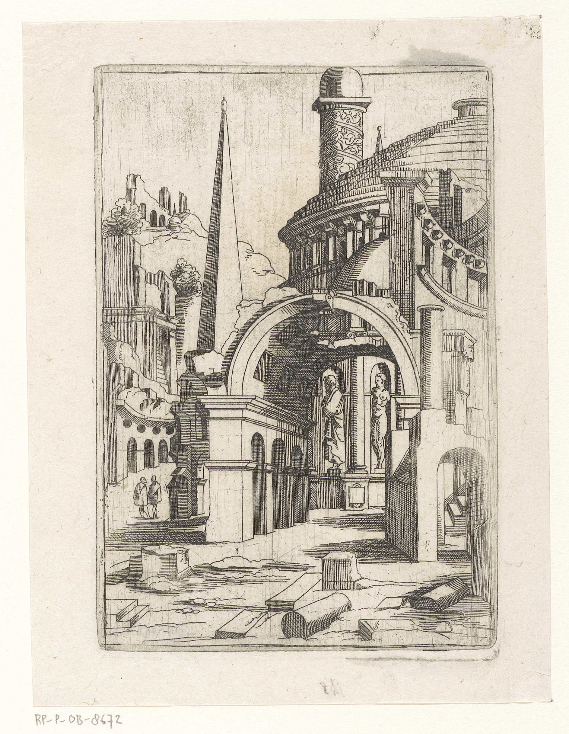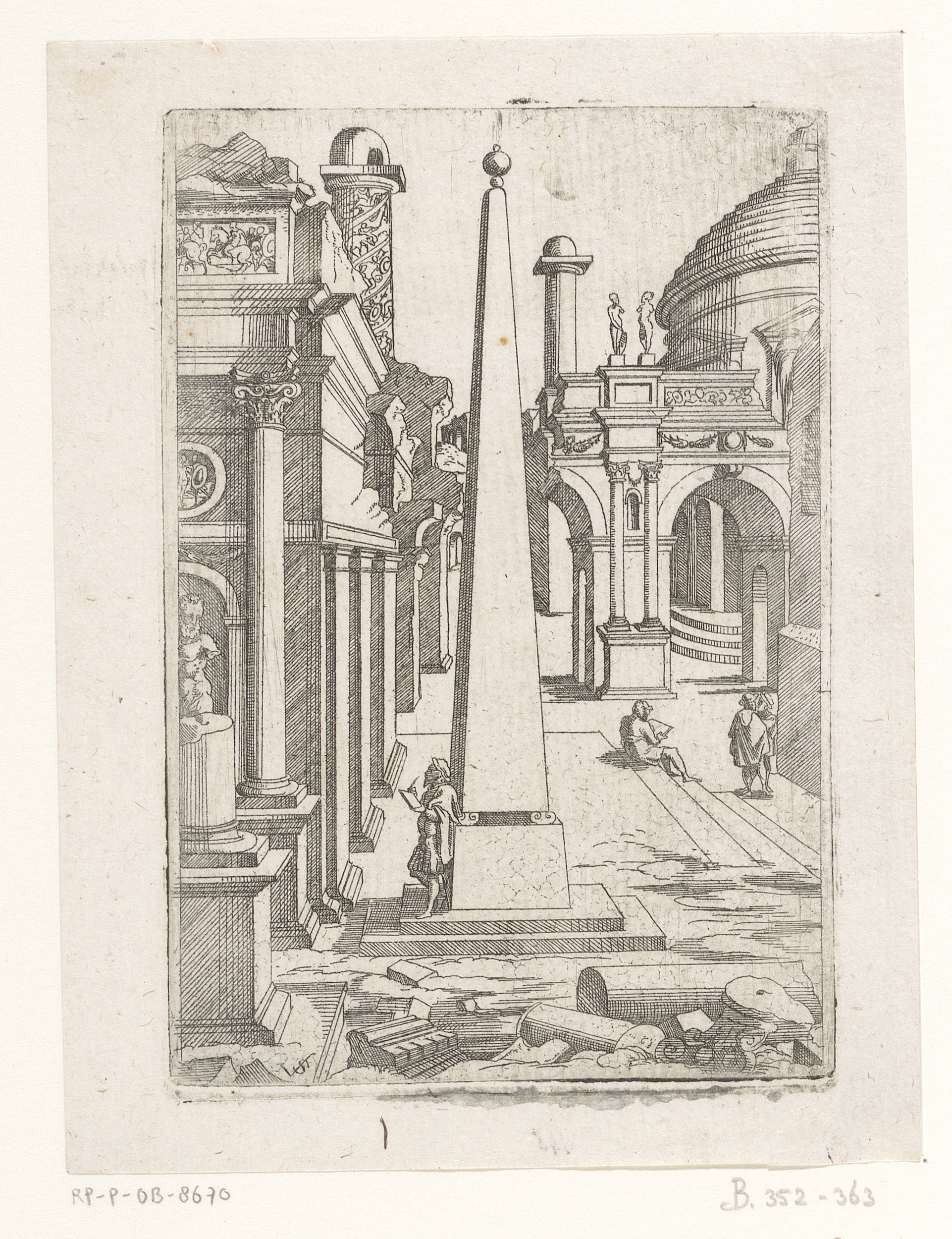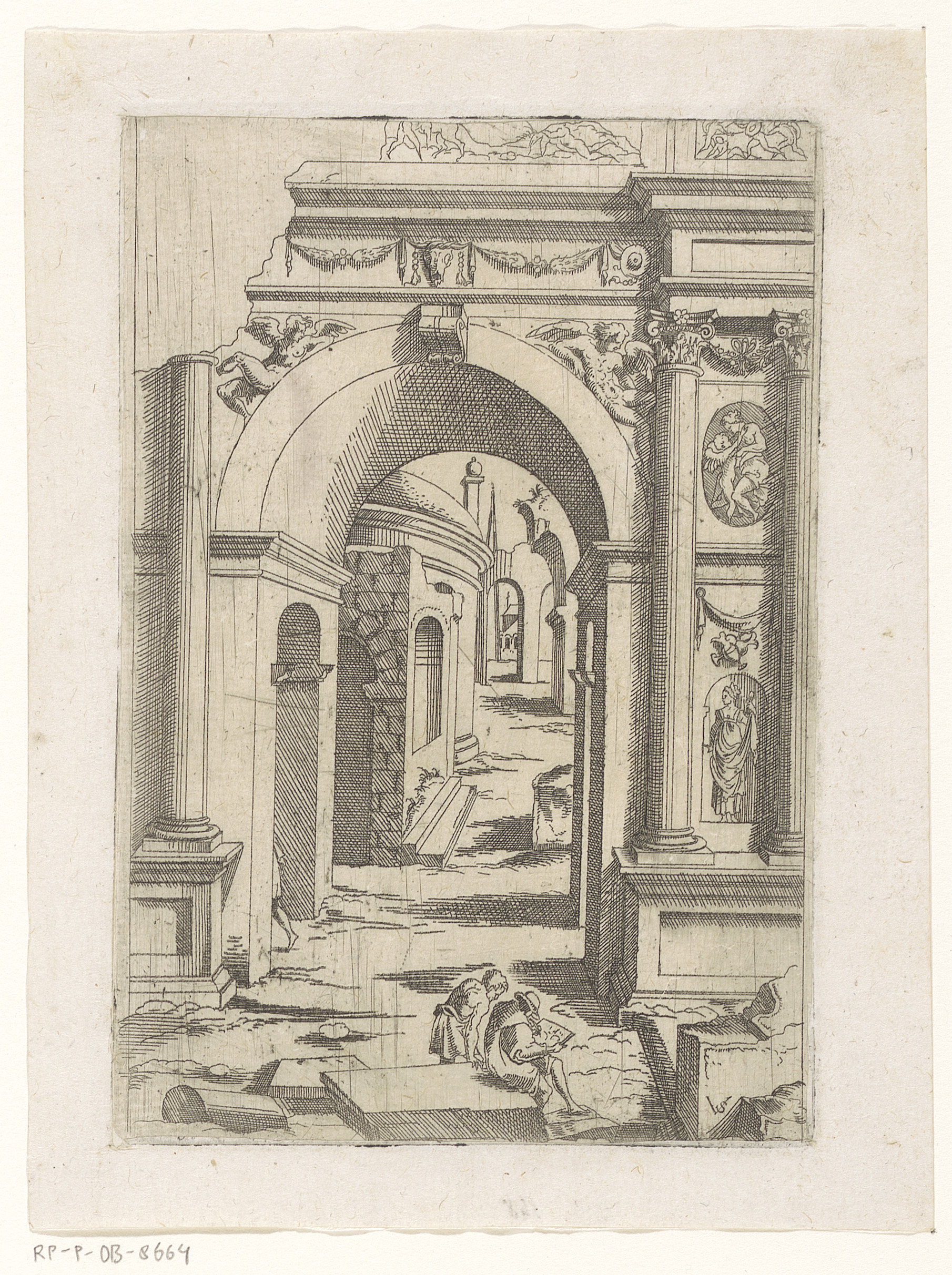 Ruïneuze bouwwerken waaronder drie Korinthische zuilen